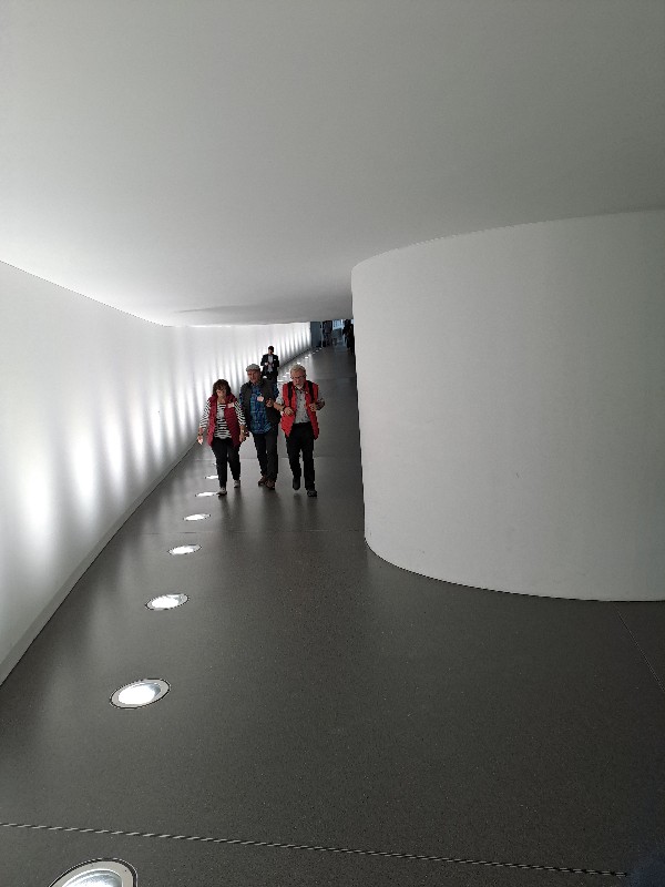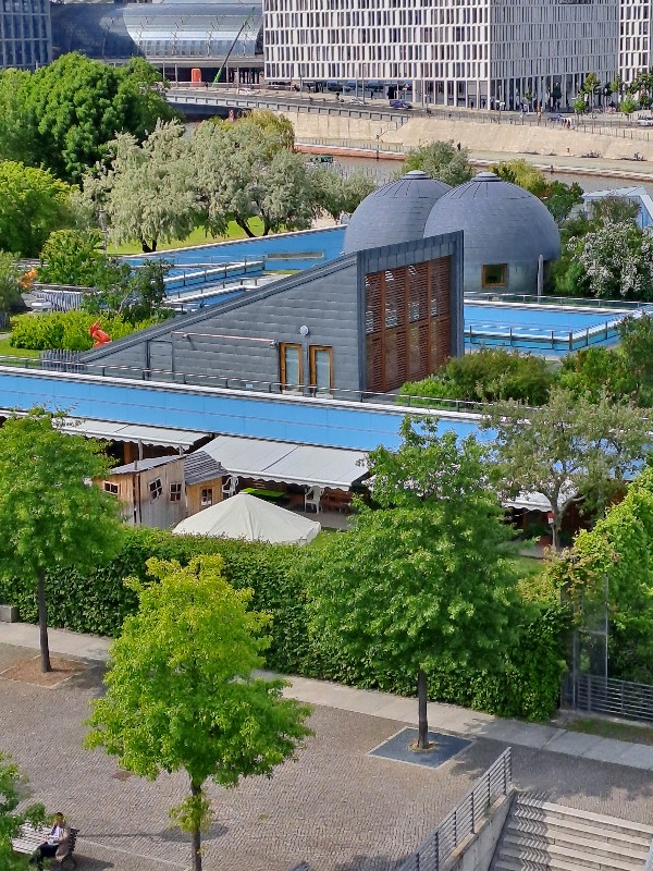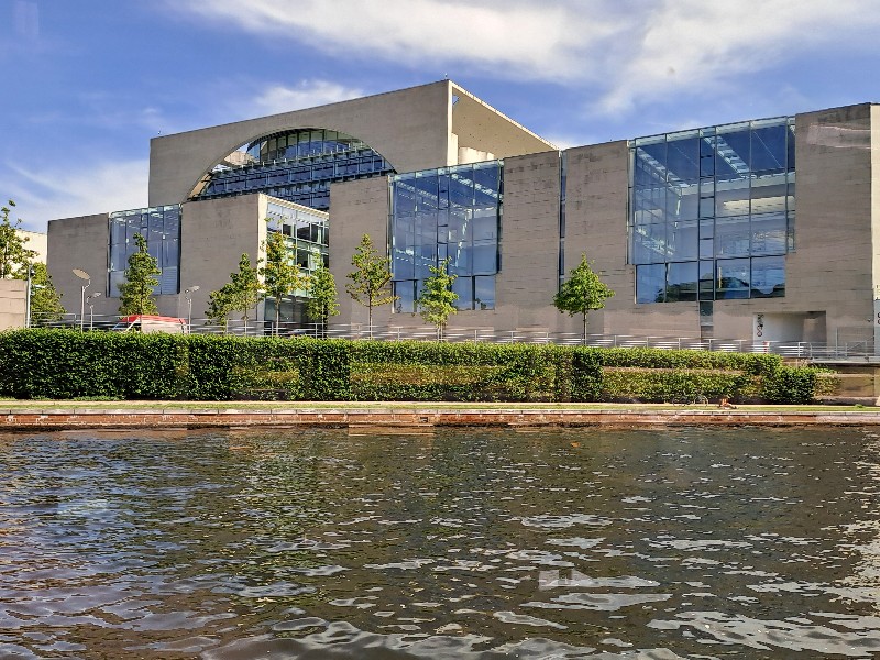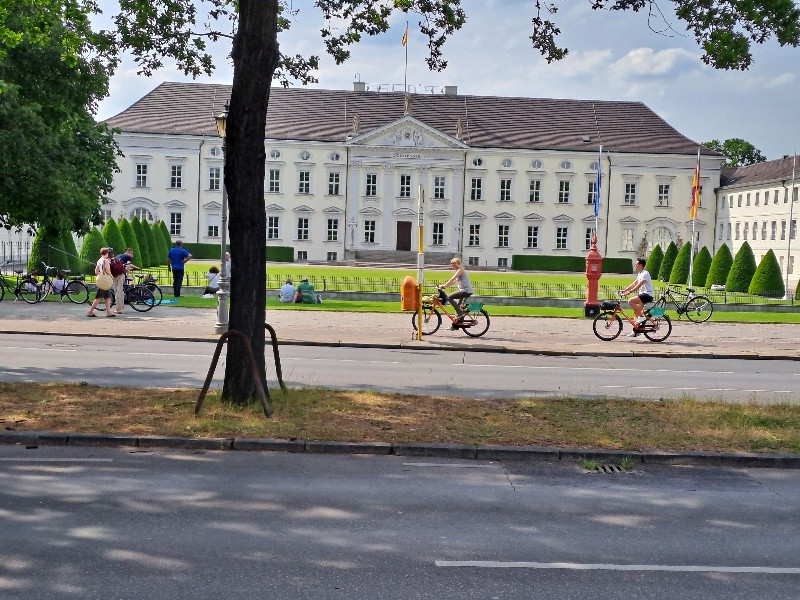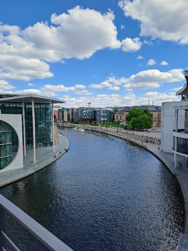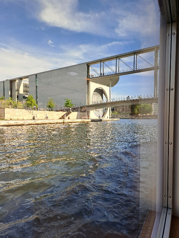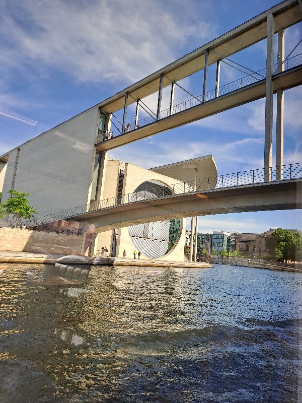 Der 2.6.2022 führte uns in die Innenstadt und zum Besuch des Bundestages, der vorher gebucht war. Wir lernten das 9 € Ticket schätzen, da wir immer mit öffentlichen Verkehrsmitteln fahren konnten. Achim hatte sich extra eine App mit den Verbindungen auf sein Handy geladen und führte uns alle Tage pünktlich zu den Verkehrsmitteln. Leider war der Plenarsaal und die Kuppel ausgebucht. Stattdessen durften wir die „höhere Beamtenlaufbahn“ betreten. Eine Brücke über die Spree, die normalerweise nur von den Abgeordneten betreten werden darf und die unterschiedlichsten Sitzungssäle verbindet. Von dort aus hatten wir einen schönen Blick auf die Spree.