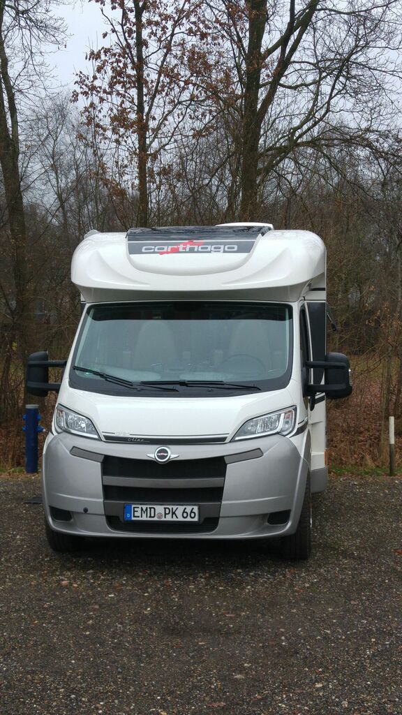 Hier unser neues Reisemobil auf dem Stellplatz mit Ausblick auf eine freie Wiese.