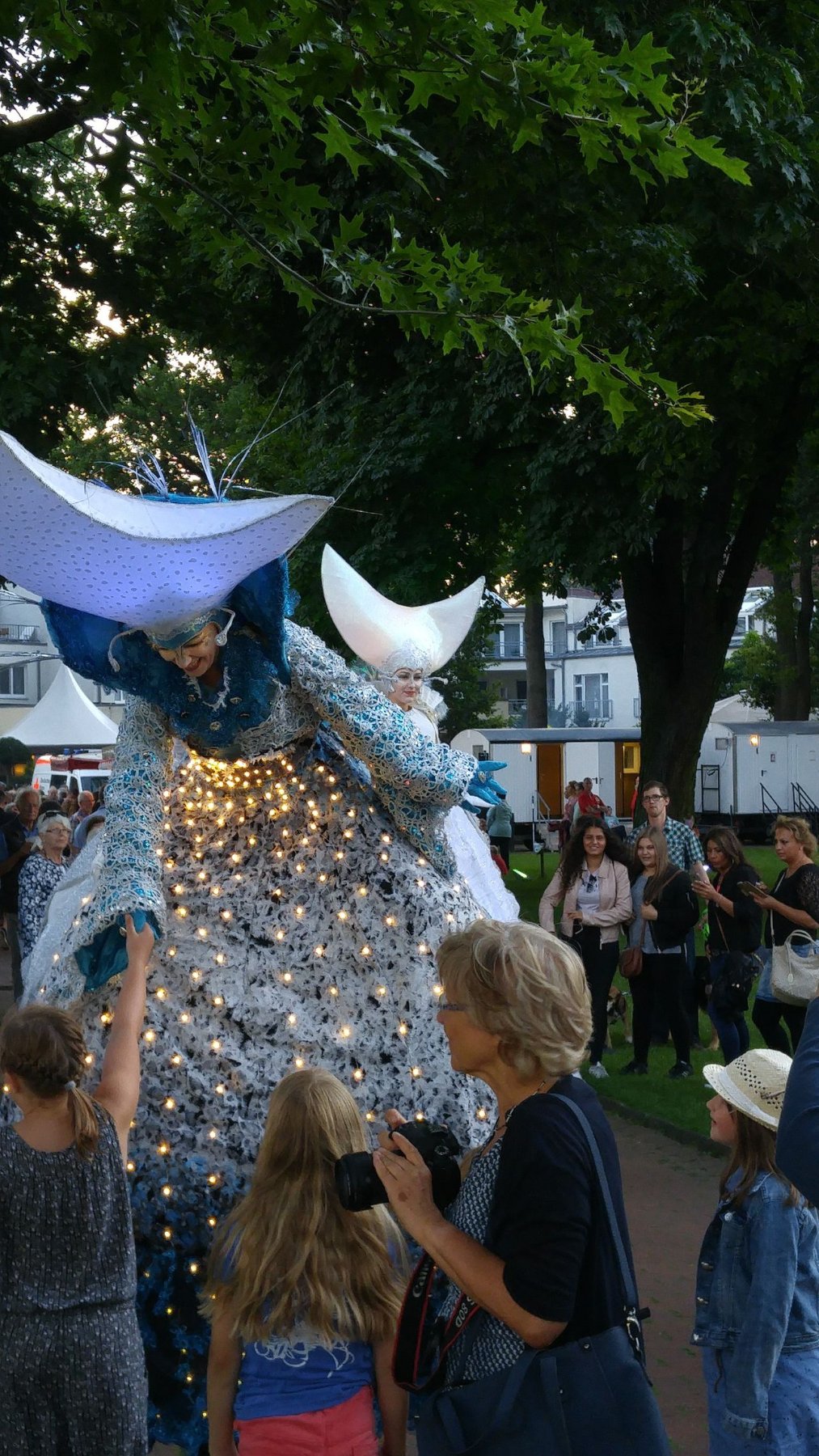 Drei "Grazien" auf Stelzen liefen beleuchtet durch den Park